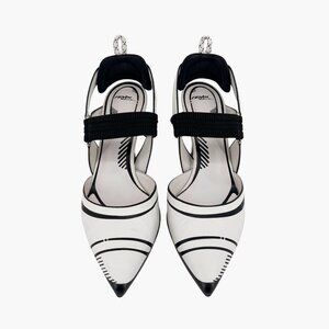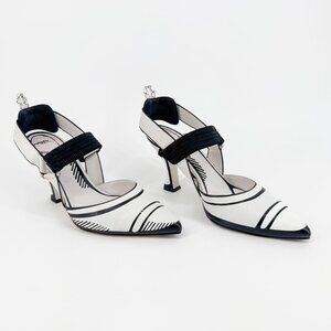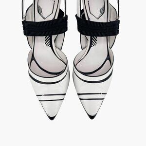 These Fendi x Joshua Vides collab Colibri pumps feature white leather uppers with contrast black outlining, a pointed toe, and a Mary Jane-style strap. The 3.5-inch heel, elastic slingback strap, and cartoon artistic edge make these shoes an elevated choice for creative workwear or statement styling.