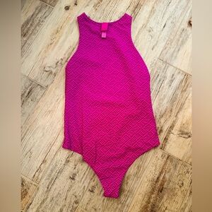 This bodysuit features a captivating purple color with an intricate geometric pattern, creating a visually striking look. The high neckline and tank-style cut offer a modern and sleek silhouette, perfect for any occasion. Crafted with precision, this piece combines elegance with a touch of boldness.