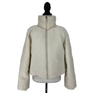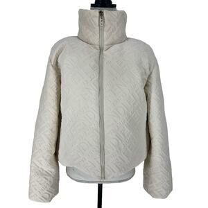 From the highly sought-after FENDI x SKIMS limited-edition capsule collection, this white down puffer jacket is the ultimate blend of high fashion and cozy luxury. Crafted from a Lycra blend, it features a sculptural cropped silhouette with dramatic bell sleeves, a high neck, and adjustable drawstring hem for a tailored fit. The exterior is embossed with tonal 3D FENDI SKIMS logo print for a bold but elegant statement. Side zip pockets add practicality, and the full zip closure keeps you warm and chic in cold weather. A rare and collectible collaboration piece ideal for luxury streetwear lovers and designer outerwear collectors.