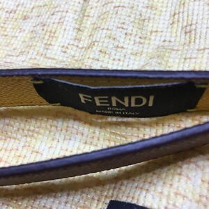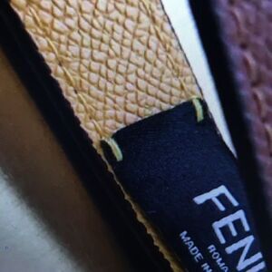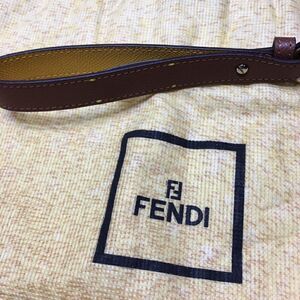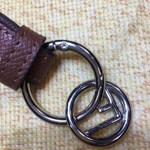Fendi brown leather key fob strap with silver hardware. I added a repurposed F silver logo ring. Fendi tag on inside of strap, inside strap color mustard.