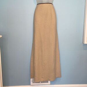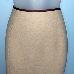 Authentic Vintage Fendi Tan Wool Long Skirt. Made in Italy. This rare piece is preowned and shows some sign of wear at the seams. Chocolate brown elastic piping at the waistline. Wool blend skirt has nylon/elastan to give the skirt stretch to fit the body's curves. Classic, timeless and elegant. Soft to the touch. Size -40 USA -6
