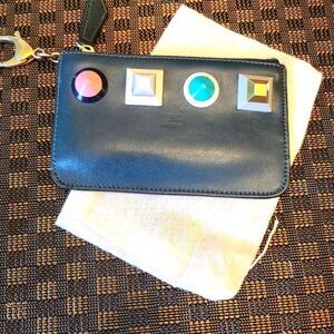 Fendi studded Leather coin purse in a gorgeous deep dark hunter green color. All studs are in perfect condition, Leather and interior lining in clean good condition. Does not come with original garment bag but will be shipped with a plain garment bag for storage.