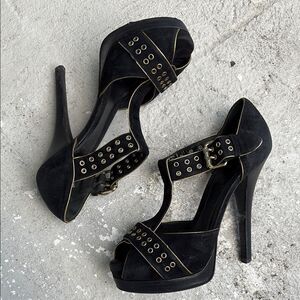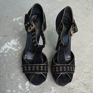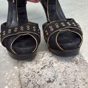 Check out the pictures. These are in good condition but not new. They need a little cleanup and as you see from the pictures a little touchup. Platform height is half an inch heel height is 5.5 inches.
