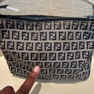 Fendi Zucchino Mini Bag Navy White FF Logo Slouchy Baguette Shoulder Purse