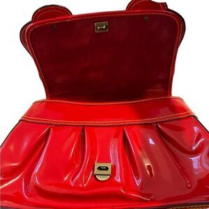 Retail $1730. Red patent leather shoulder bag with small interior pocket, yellow contrast stitching and antique brass-tone hardwar