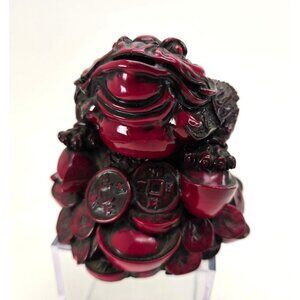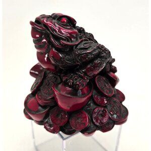 This elegantly crafted Feng Shui Money Frog figurine embodies traditional symbolism for attracting prosperity and wealth. With intricate detailing, this three-legged toad sits atop a pile of ancient Chinese coins, making it a sophisticated addition to your home or office decor.