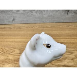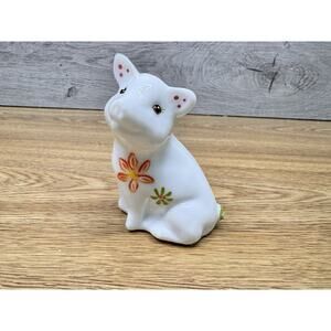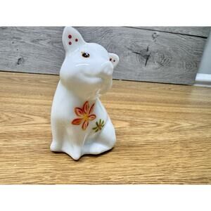 Adorable Fenton Baby Pig Figurine made of glossy milk glass and hand painted with colorful floral accents. This charming piece showcases Fenton’s signature craftsmanship and attention to detail, featuring delicate brushwork and a sweet, expressive face.