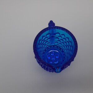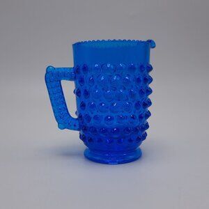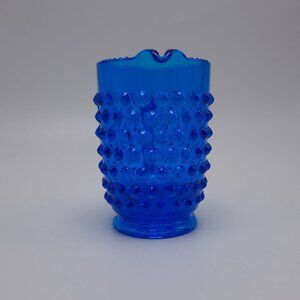 This vibrant blue glass hobnail piece serves as a charming miniature pitcher or creamer, doubling as a toothpick holder. Its textured design adds a touch of elegance to any table setting or collection. Crafted with precision, this compact decorative item is a versatile and timeless addition to your home.