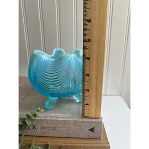 Fenton Blue Opalescent Glass Three Footed Rose Bowl Vase Drape Design