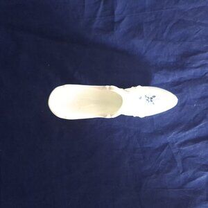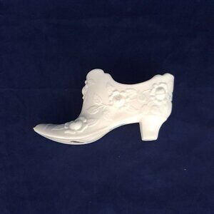 This Fenton slipper is adorned with intricate cabbage rose designs. Crafted from white milk glass, it features delicate hand-painted accents, adding a touch of elegance to any display.