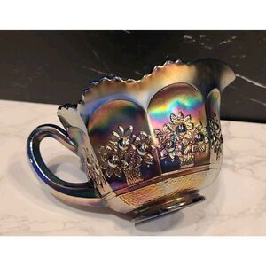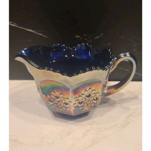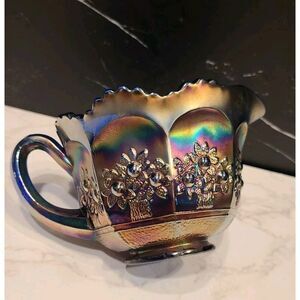 (1) Vintage Fenton Carnival Glass Creamer with Handle | Orange Tree Pattern | Blue Base | Scallop Edge | Good USED Vintage Condition | No chips or cracks | *Flaw, light signs of previous use | Please refer to the photos for the condition | Weight before packaging 13oz.