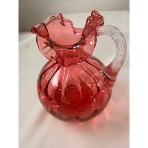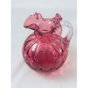 Cranberry glass pitcher showcases a vibrant ruby hue with a classic optic rib pattern on a bulbous body. The design features a dramatic ruffled or crimped rim and a clear, reeded applied handle that adds a sophisticated contrast. Hand-blown craftsmanship is evident in the delicate texture and rich color, making it a standout piece for any art glass collection or as a decorative accent.