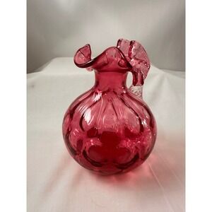 Fenton Cranberry Glass Pitcher Ruffled Rim Applied Reeded Handle Optic Rib Red