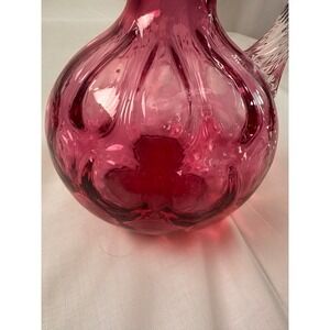 Keywords: Victorian, MCM, Art Glass, Handblown, Decorative, Collectible, Ruby, Pink, Reeded Handle, Crimped Edge, Optic Ribbed, Fenton Style, Pilgrim Style, Home Decor, Gift