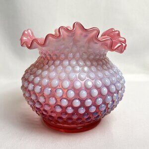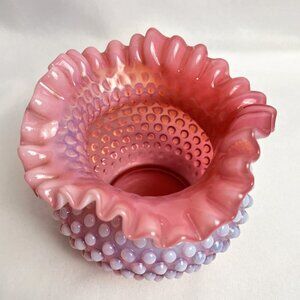 Fenton’s signature style, the stunning hobnail pattern perfect for collectors of depression glass and mid-century American artistry. The ruffled edge catches the light showcasing the soft milky opalescence which contrasts with the rich cranberry color.