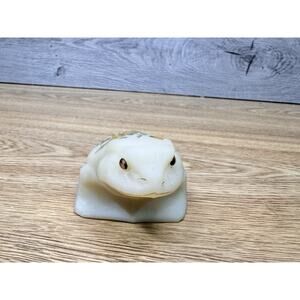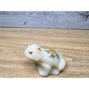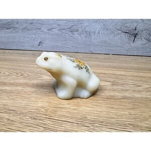 Vintage Fenton Custard Glass Frog Figurine beautifully hand painted with yellow and green floral accents. This charming collectible features Fenton’s signature satin custard glass finish and fine detailing. A lovely addition to any Fenton or glass animal collection.