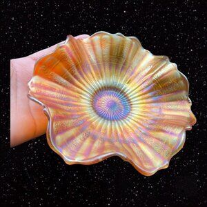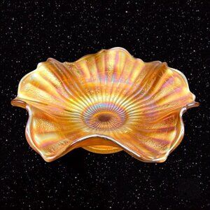 Fenton Glass Stippled Rays Scale Band Exterior Iridescent Bowl Marigold 6.5”W 2”.