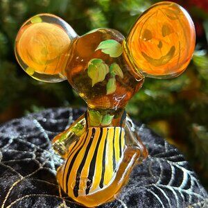 Fenton Art Glass Hand Painted and Signed Halloween Mouse in translucent Autumn Gold