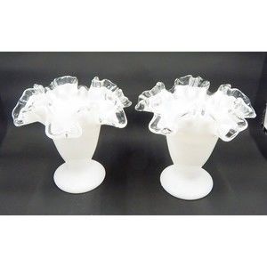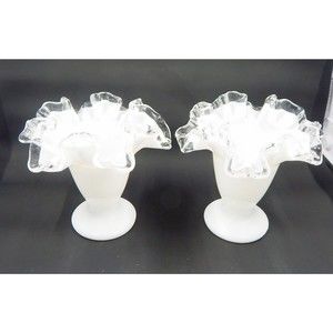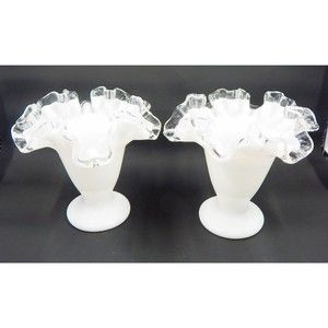Fenton Milk Glass Silver Crest Ruffled Edge Footed Trumpet Vase 4 Inch Pair