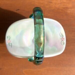 Fenton Mini Basket White 4.5" Iridescent Peacock Tail Floral Signed QVC 2001