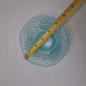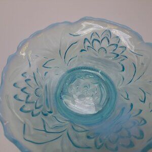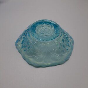 This Fenton opalescent blue glass bowl features intricately detailed water lily and cattail designs. Its ruffled edge adds flair, making it a striking vintage collectible. Measures 5 1/4" wide.