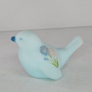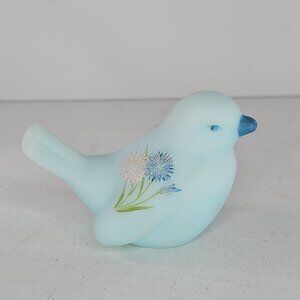 Fenton Painted Blue Satin Glass Bird Figurine Floral Design Signed Pam Miller