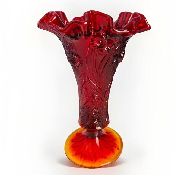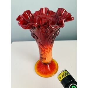 Fenton Ruby Red Amberina Cadmium Glass Stretch Vase Ruffled Tulip Orange Glows