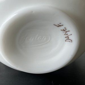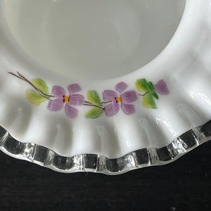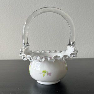 This beautiful basket is in the Silver Crest line, made from milk glass with a clear ruffled rim. It is hand-painted in the Violets in the Snow pattern, both on the top and sides. The handle is shaped to appear like bamboo. Perfect to add to your Fenton collection, or for your Easter decor! Measures 6.25" tall and 5" across the rim. Signed by Dane F. (Frederick) on the bottom, a long-time Fenton painter, with the impressed Fenton mark.