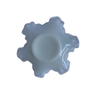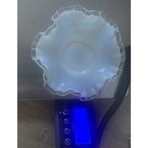 This beautiful candy dish is perfect for your collection. Made of opalescent glass, it has a diameter of 5.5 inches and a height of approximately 2 inches. The dish features a stunning white color and a silver crest style that adds a touch of elegance to any room.