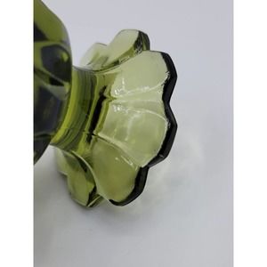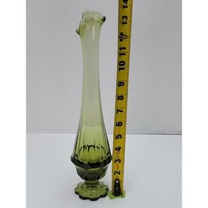 This unique Fenton Swung vase has a beautiful petal base and stands at 13 3/4 inches tall. The glossy green finish and abstract art design make this a perfect addition to any collection. The vase is made of fused glass and was produced in the United States. It is an original piece, not a licensed reproduction, and has vintage qualities. The pattern is ruffled and the brand is Fenton. The vase is in great shape with No chips, No cracks and or repairs. It would make an excellent decorative piece for any home or office.