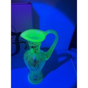This elegant pitcher is a collector’s dream — rare to find complete with the original box and paperwork, and even rarer in such pristine condition. The uranium content gives it that brilliant neon glow under UV light, making it a true showpiece for any glass collection.