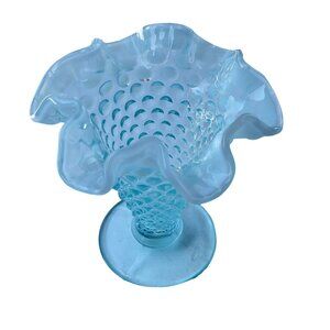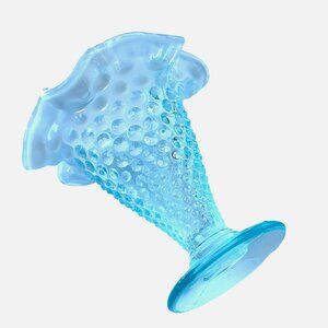 This Fenton Vintage Light Blue Opalescent Hobnail Glass Vase is a 6-inch antique collectible. The decorative piece features a ruffled edge design, capturing the essence of vintage charm.