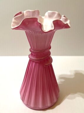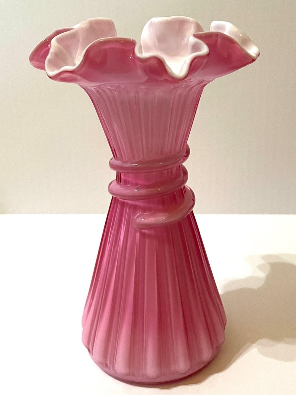 Fenton Wheat Stack Cornshock Vase Wild Rose Ruffled Rim Wheat Stack Ribbed Body