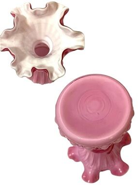 Wheat stack vase with wild rose overlay in pink exterior and white milk glass interior, no makers mark.