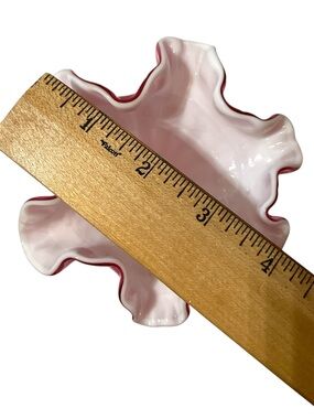 Ruffled rim, ribbed body, cinched in the middle by two glass bands