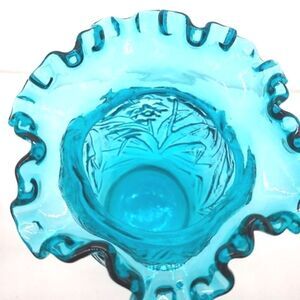 Lovely vintage Fenton teal blue green glass daffodil vase with ruffled edges. Gorgeous! Perfect for Easter and Spring.