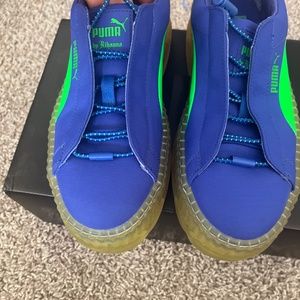 Platform Fenty Puma’s. They have clear gum bottoms but has turned a yellow color. I was told it’s a special cleaner that you can purchase to get the bottom to go back to the original color. They are in the original packaging and is gently worn.