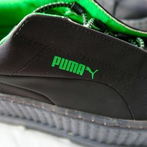 Featuring a black nylon upper with a tonal screen printed Puma Formstrip, this shoe is accented by Green Gecko highlights on the inner lining and Puma Cat logos on the padded tongue and medial side. A black elevated Creeper midsole sits atop a studded rubber outsole, while a toggle lacing system allows the shoe to easily slip on and off. Whether you're hitting the beach or the streets, the Rihanna x Fenty Cleated Creeper Surf 'Black' is sure to turn heads.