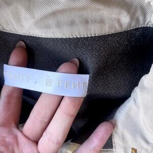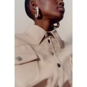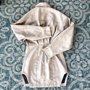 This is an authentic Fenty button-down mini dress from the "Release 5-20" collection. It features a striking collar, long sleeves with button cuffs, and large patch pockets on the chest. The dress is made of a cream-colored faux leather with contrasting beige stitching that highlights the garment's unique seaming and cinched waist. It has a full button-down front with silver-toned snap buttons and a high slit on the side. This piece embodies the brand's blend of classic silhouettes with modern, edgy details.