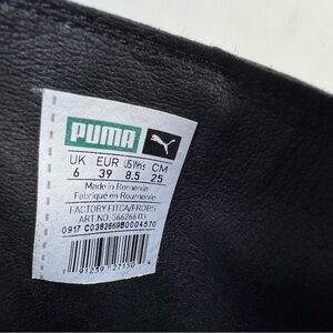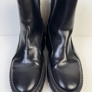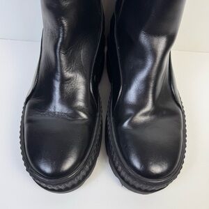 Fenty x Puma Chelsea Sneaker Boots in black leather, women’s size 8.5. Excellent pre-owned condition with minimal wear, clean soles, and no flaws. Features smooth leather upper, elastic panels, and padded insoles, Puma/Fenty heel branding, and a chunky creeper platform sole. Hybrid sneaker-boot design with a streetwear, grunge, and alt aesthetic. Rare Rihanna collab from the Fenty Puma line.