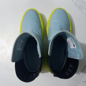 Awesome chunky combat-style Rihanna rain boots. Colors are sterling blue, black, and limeade. The profile of these boots is really stunning, favorites from my collection. Made with genuine cowhide and rubber sole. Light signs of wear in the toes.
