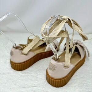 Like new Fenty platform sandals. They feature thick rubber platform soles, and a lightly pink hued upper with a bow on the cap toe.