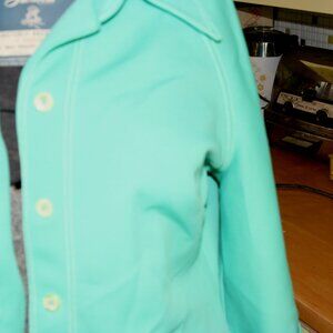 This is a blazer by Fenwick Casuals. It is a polyester style with a great collar and cuffs. The buttons have a great look to them too. It is marked as size 14 and is about 25 inches long and 19 inches pit to pit. There are some puck lines. It is a bit wrinkly from storage (a bit crammed on the rack). There is a bit of stitching missing on the back of the right sleeve. Still a great coat.