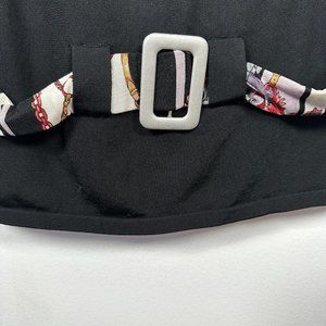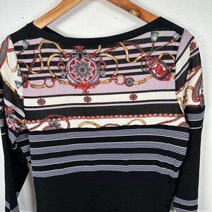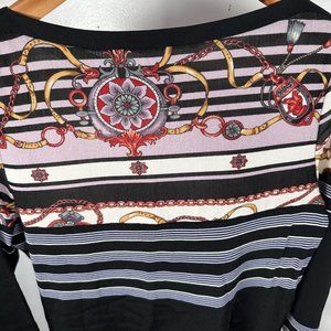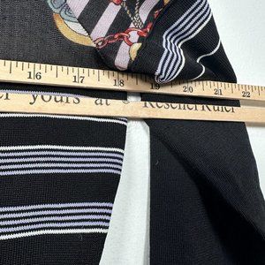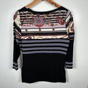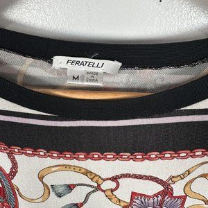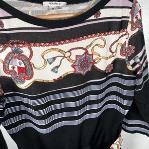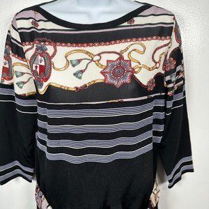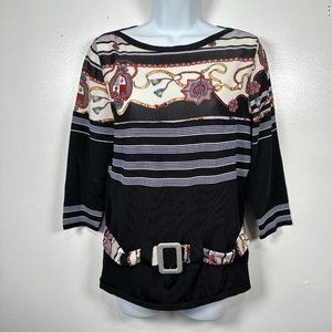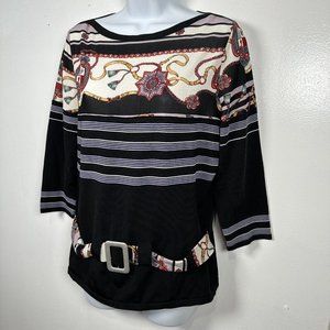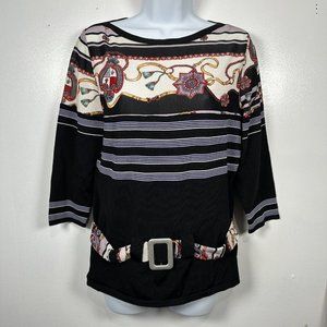 Feratelli Womens Medium Blouse Belted Art Stretch Black 3/4 Sleeves Striped