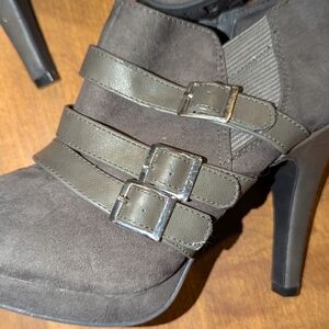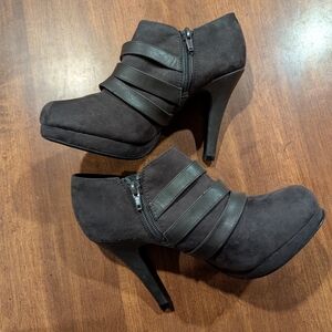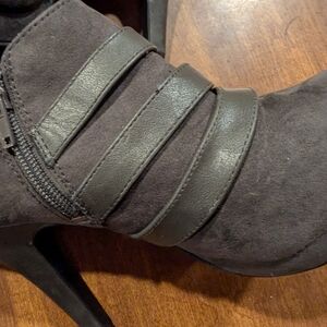 Elevate your look with these Fergalicious heeled boots, crafted in a sleek black suede finish. The high slender heel and three buckle straps add a touch of sophistication, while the slight platform ensures comfort and style. Perfect for making a statement, these boots are a must-have addition to your wardrobe.