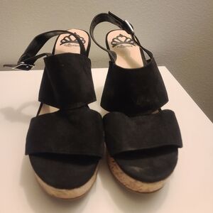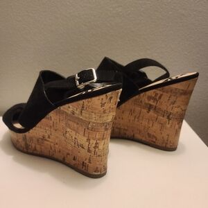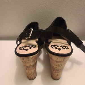 Fergalicious Black Strappy Cork Wedge Heels Shoes