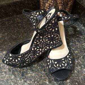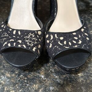Step out in style with these elegant black and cream lace patterned wedges. Perfect for any occasion, these shoes offer both comfort and sophistication.