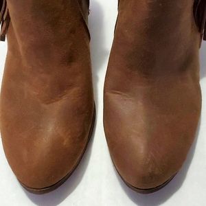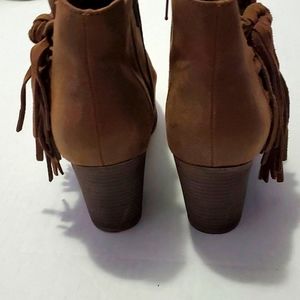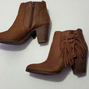 Brownish fringed ankle boots. Zippers on the inside for easy on and off. Rounded toes. 3" block heels. Padded insoles and rubber outsoles. Leather upper. Pristine condition.