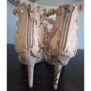 Pre-owned Fergalicious heels in a tan/gold snakeskin. These heels are in great condition.
