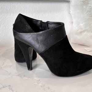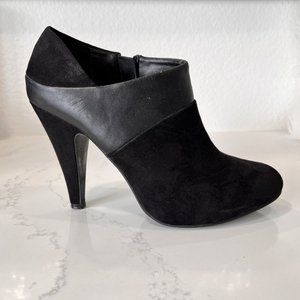 Fergalicious booty in faux leather and suede. Size 8, previously worn and in good condition. Easy on/off with side zipper detail. Heel height: 4” Looks great with jeans or a dress.
